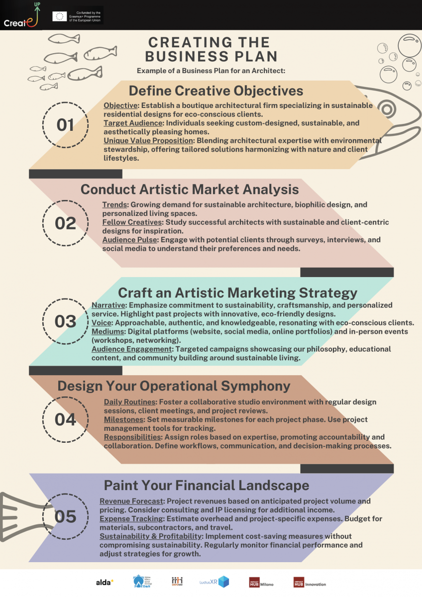 S prepletanjem teh elementov v celovit poslovni načrt ustvarjalni posamezniki pridobijo jasnost, usmeritev in samozavest. Dobro izdelan poslovni načrt je vodilo, ki kreativne podvige vodi skozi podjetniški labirint proti uspehu.