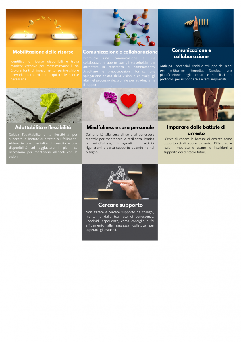 Strategie come la mobilitazione delle risorse, la comunicazione, la gestione del rischio, l'adattabilità, la consapevolezza, l'apprendimento dai fallimenti e la ricerca di supporto aiutano a superare gli ostacoli per realizzare una vision.