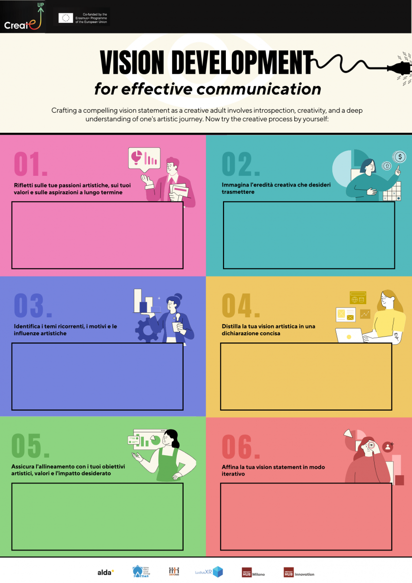 Le vision statement fungono da bussole essenziali per orientare il percorso creativo, guidando gli individui verso le loro aspirazioni artistiche e obiettivi a lungo termine. Racchiudono l'essenza delle ambizioni creative, fornendo chiarezza di intenti e accendendo la motivazione necessaria per dare vita alle visioni artistiche.